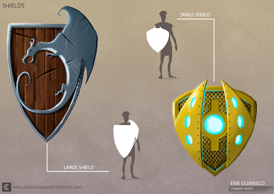 Then I thought about making these shields. The first sketch is based on a simple shield made by humans. The second is a magic shield designed by dwarves. It will light your way and you protect.